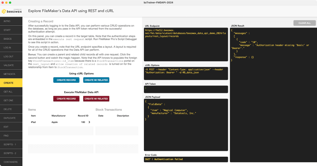 We're providing a tutorial file (bzTrainer-FMDAPI) to help you learn and experiment with various REST and cURL functions using FileMaker's Data API. Enjoy exploring!