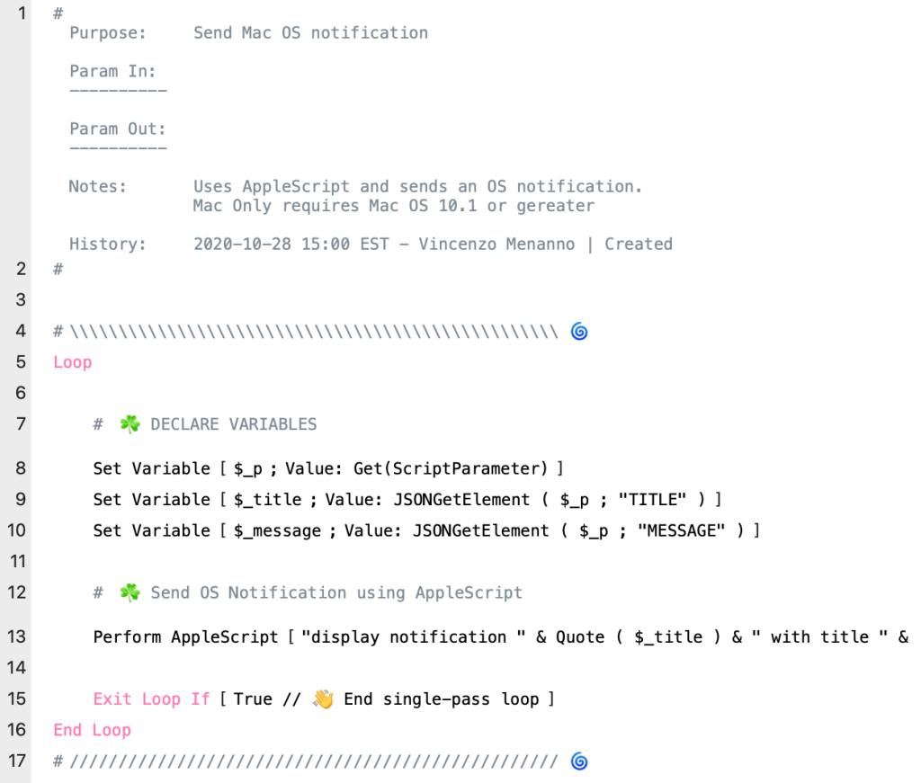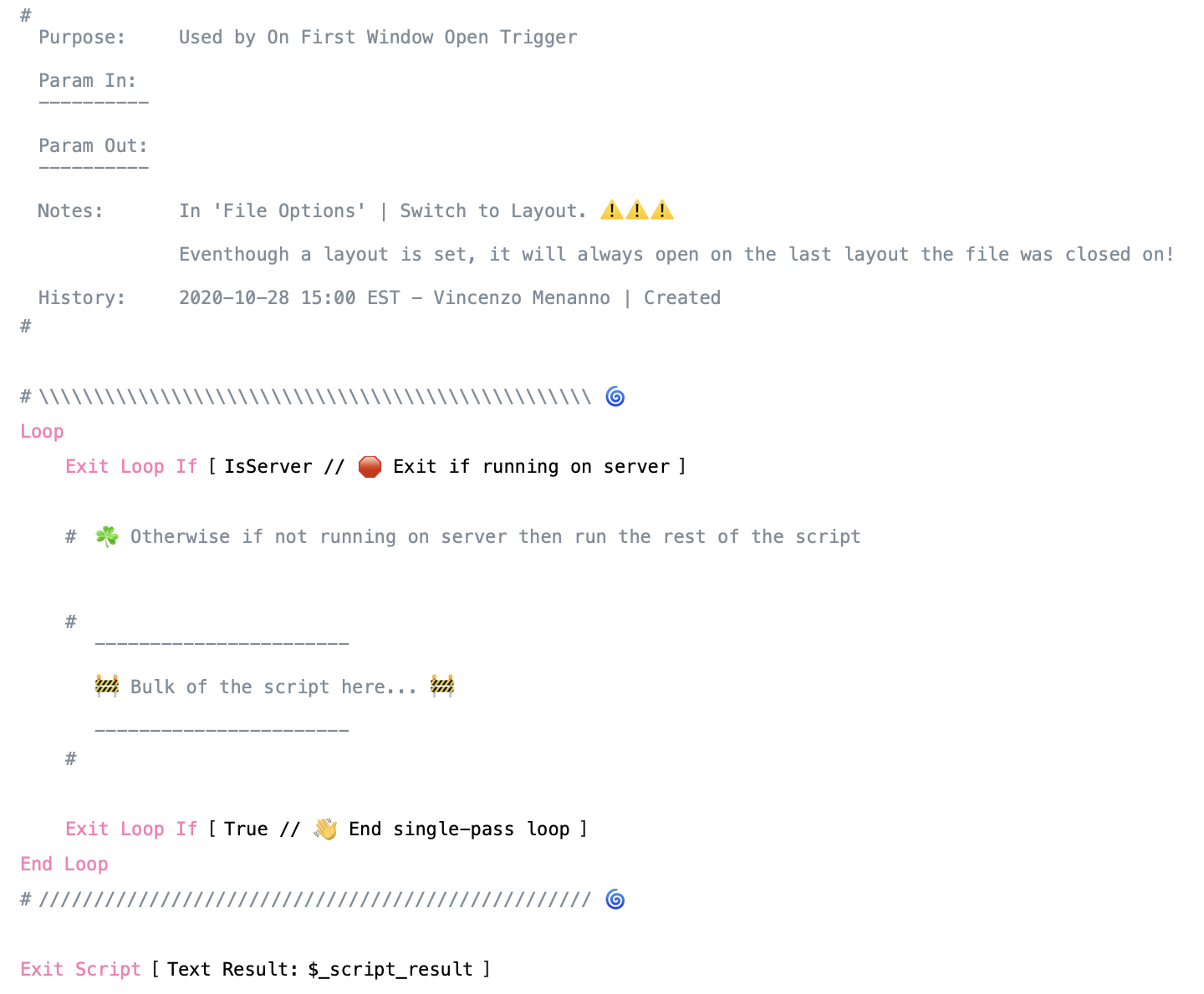 A best practice is to exit out of these File Options script triggers as soon as they run. Here is what the main block of our start up scripts look like. Note that I've used Single Pass Loops everywhere, and generous helpings of emojis 😎! This is to help call out attention🧑🏼✈️ and 🚧 warnings to things 🥬.