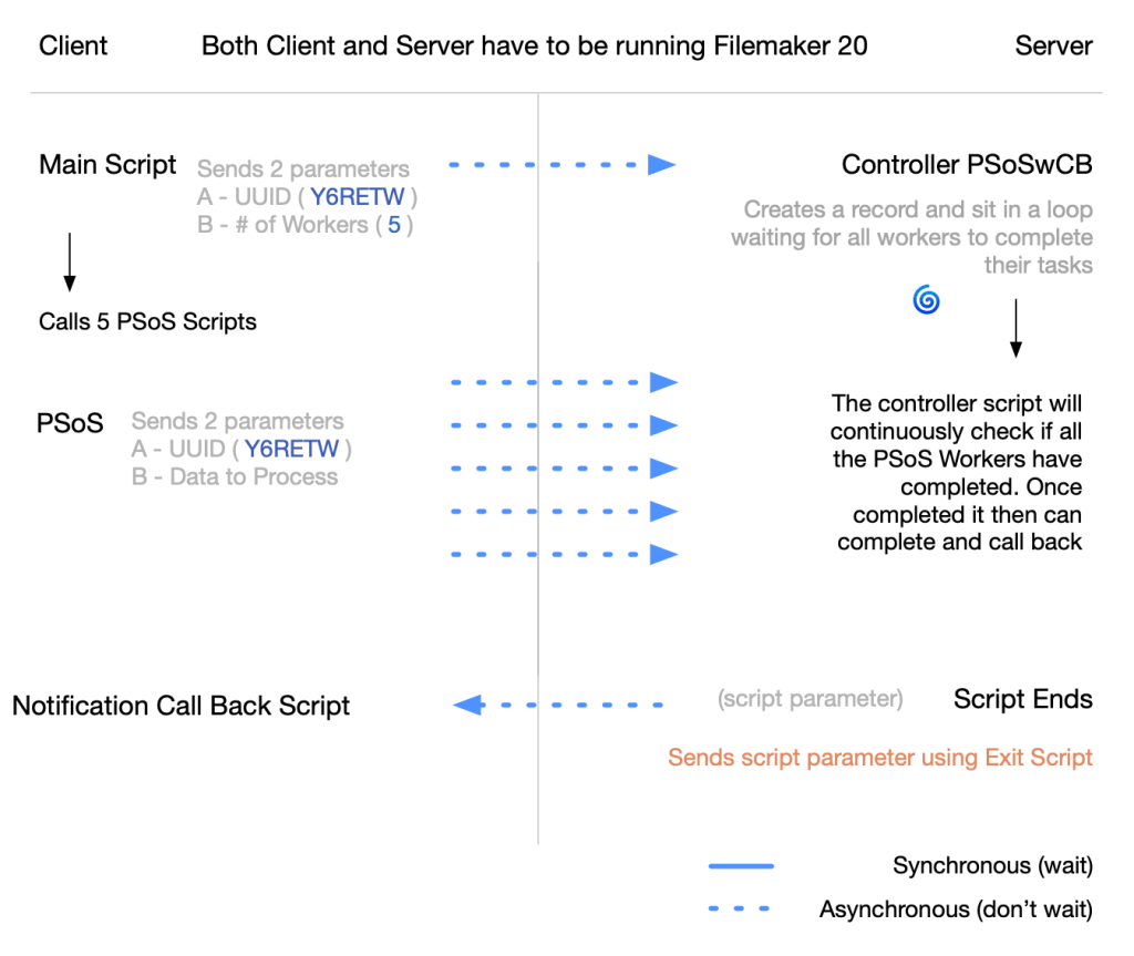 The Main Script calls a PSoSwCB script and sends a UUID along with the number of workers. The Controller ( a PSoSwCB script ) creates a record and stores the UUID along with the number of workers and then sits waiting in a loop. Each time a worker completes its task of gathering data it will then update that Controller record. Once the Controller loop script sees that all the workers have completed then it exits the loop and triggers the Callback script on the client.